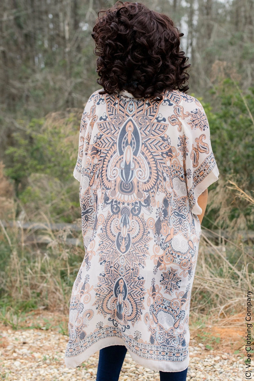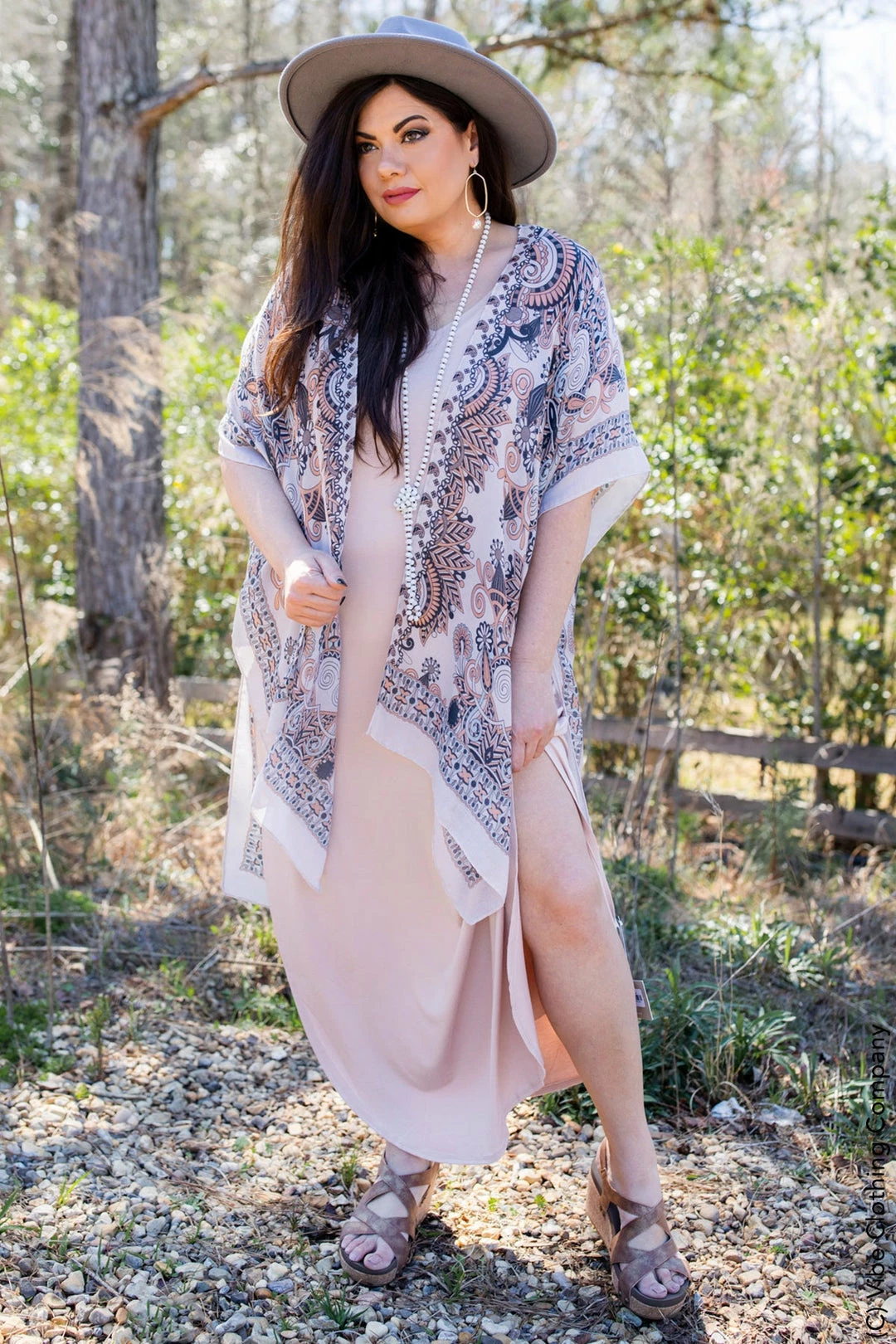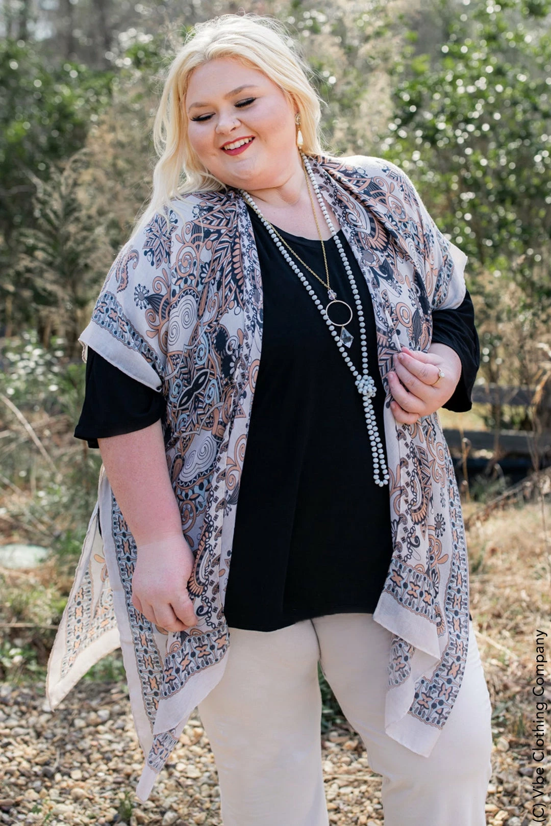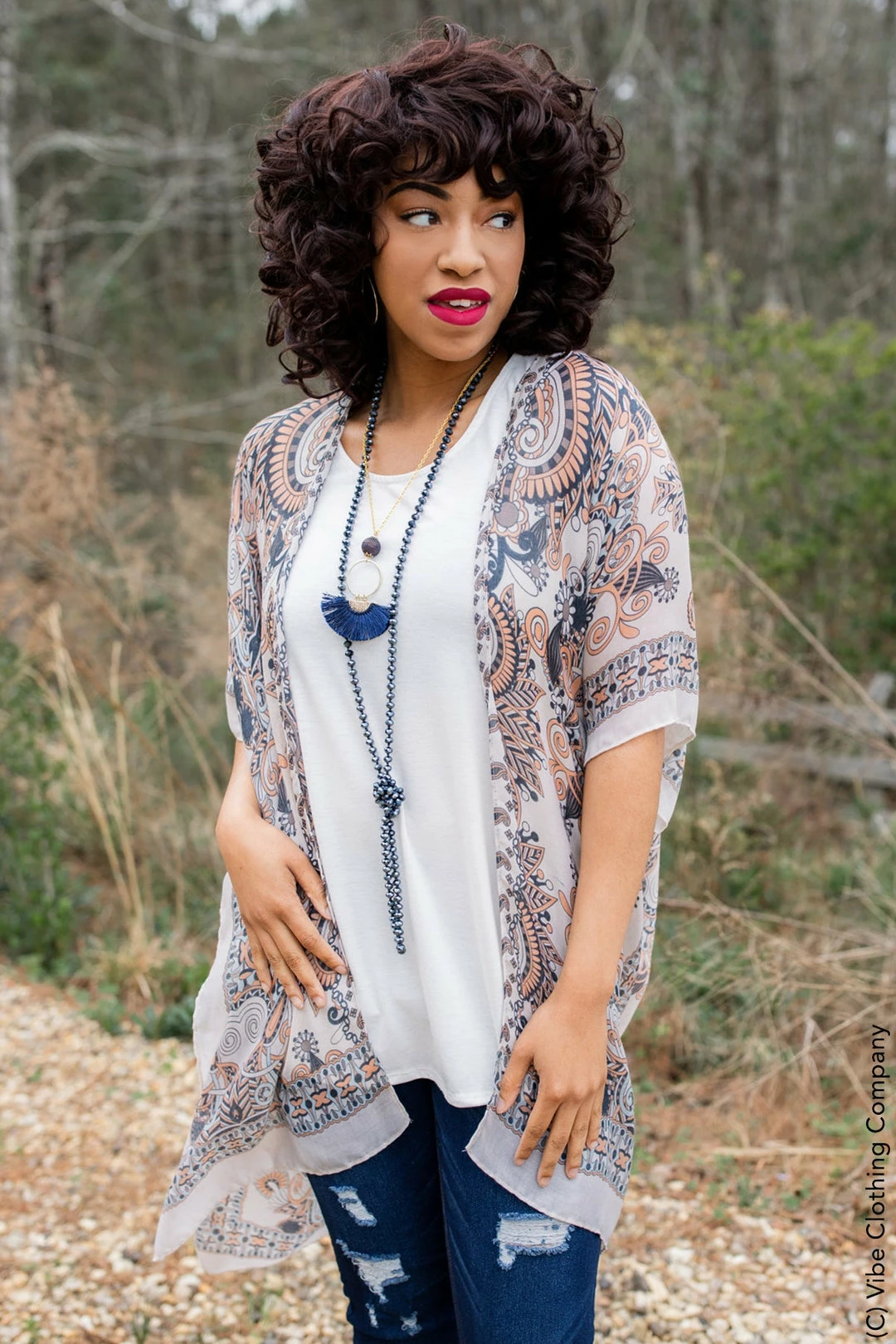 Bring on the BoHo Vibes in the NEW Trending Tranquility Kimono! It has a beautiful neutral background, with a filigree paisley print that includes subdued vintage washed colors. Style it over a top, graphic tee, dress, or tunic for a BoHo feel to complete the look!