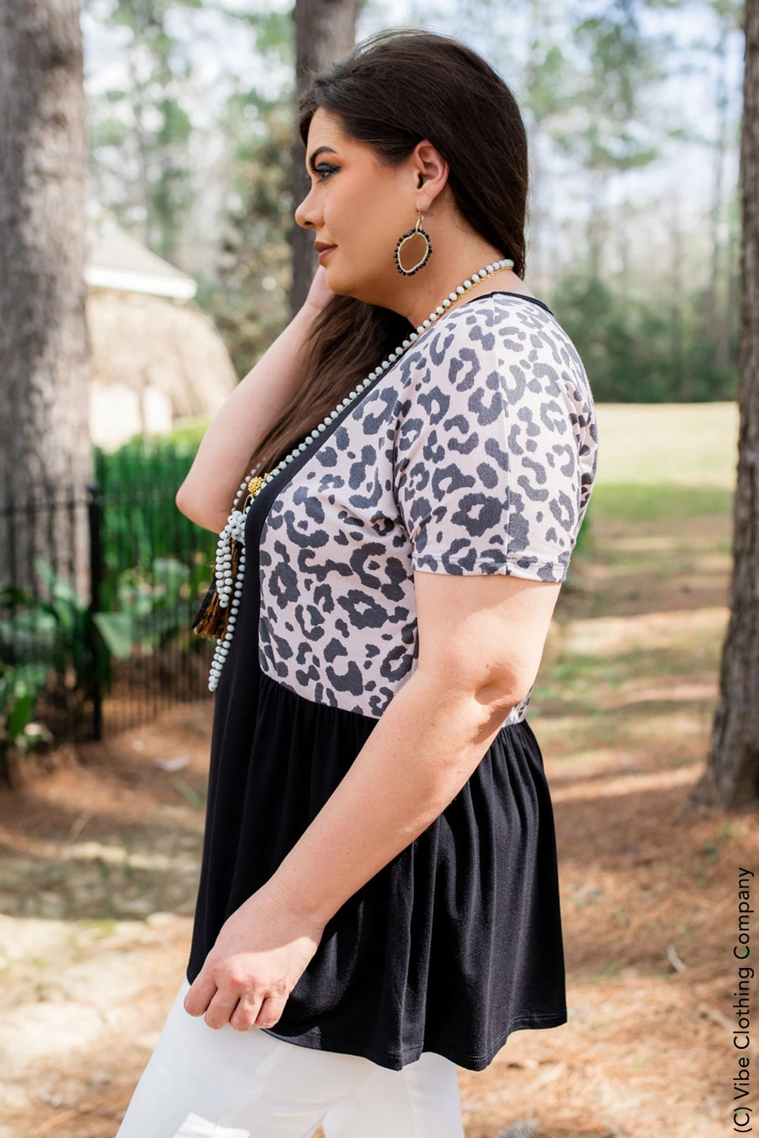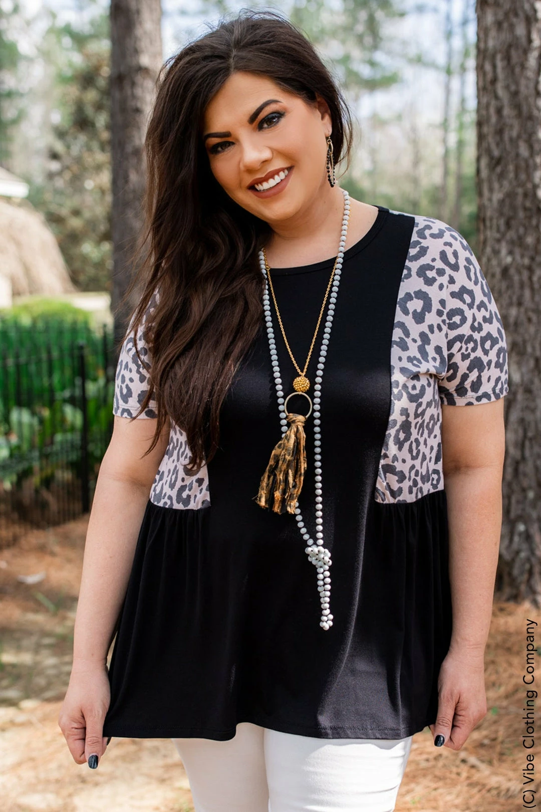 This cute top has a figure-flattering baby-doll fit. The soft, stretchy fabric is perfect to keep you cool and comfortable. Black with color blocking leopard print on the sides is so chic.