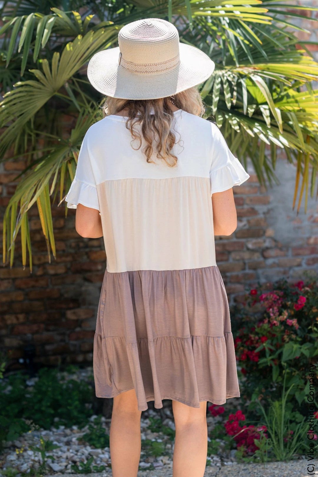 This new dress has a swing babydoll fit. The round shaped neckline with color block tiers, flutter sleeves and longer hemline are an easy breezy addition to your wardrobe.