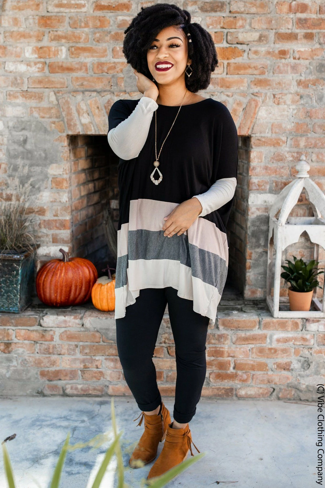 You will want to wear this versatile oversized top all the time! It’s a rounded neckline with dolman sleeves, neutral striped color blocking and black bodice make it a closet favorite!