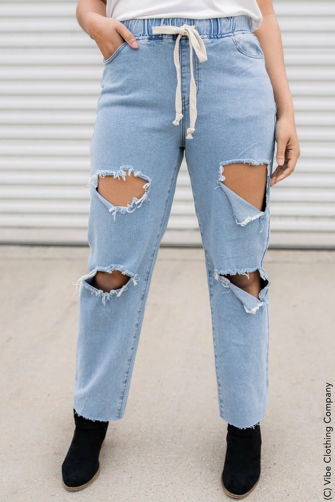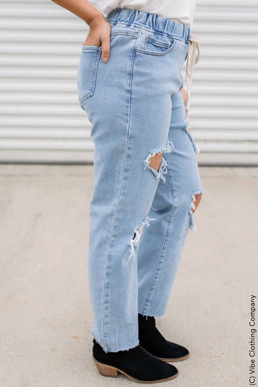 This new style of jean is so ON TREND and we are OBSESSED! These boyfriend jeans are a light wash with distressing down the front of the pant. These relaxed jeans cut off around your ankle and are more of a straight silhouette. They have a drawstring waistband and pockets in the front and back and a raw hemline.
