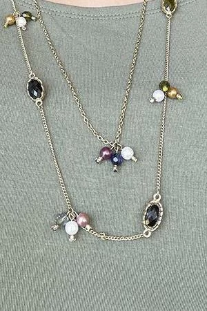 This dazzling accent necklace is a double chain with Autumn-color charms! You can’t go wrong with the antique gold metal, plus the unique design is so beautiful and delicate!
