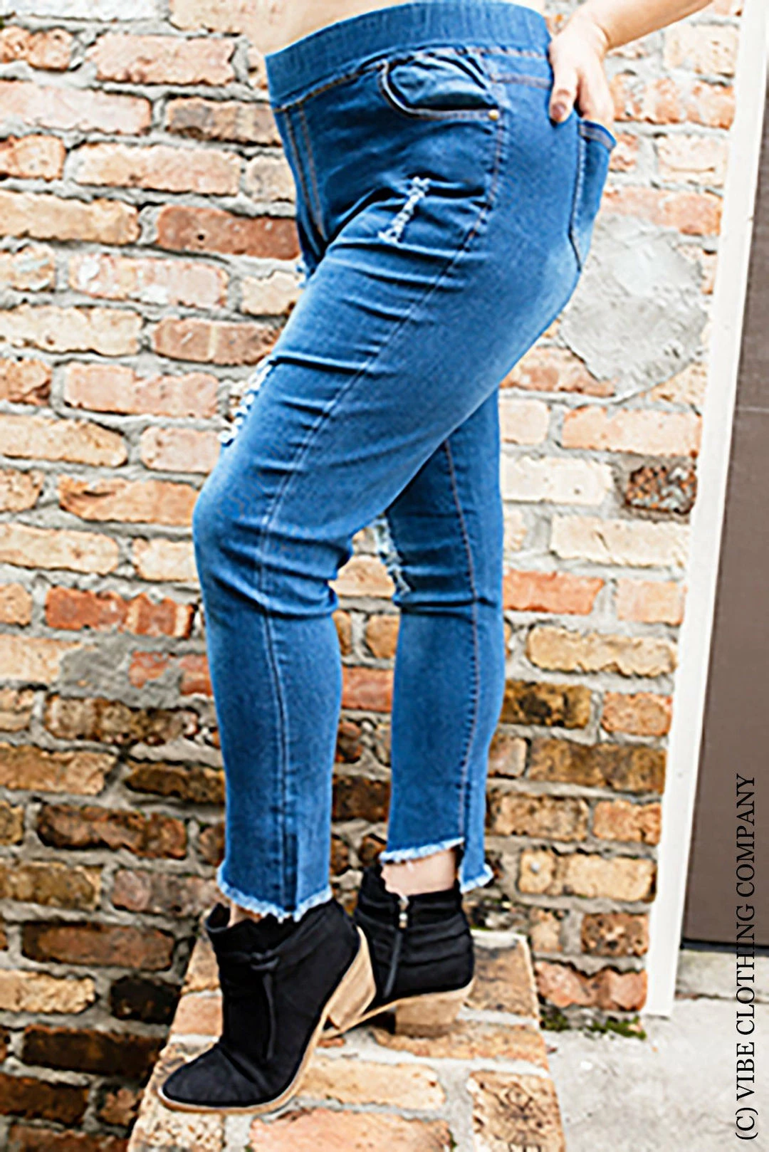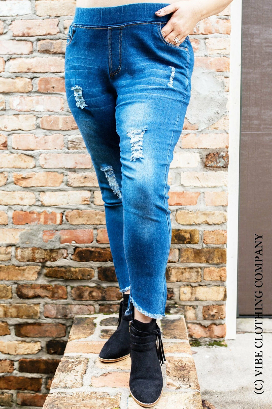 Just like our original  – Caspian, these are amazing!  You can forget buttons or zippers! These have the classic dark denim wash. High waisted with a stretch waist band and stretchy denim fabric! So comfy! These pants fit curves AMAZINGLY!