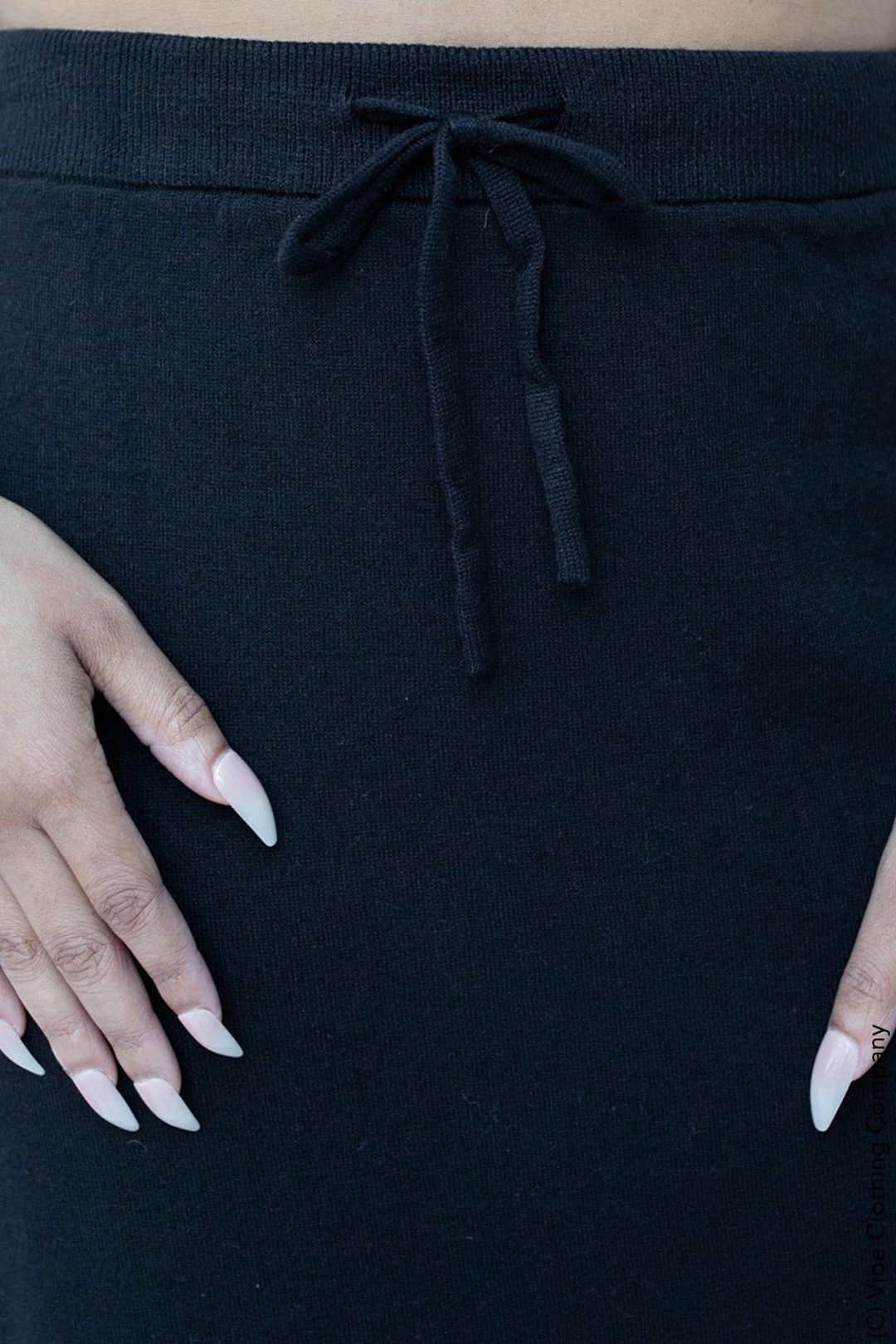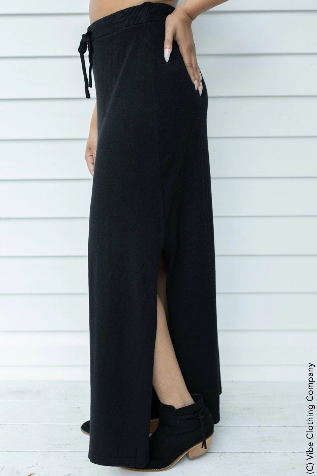 This new skirt is an absolute MUST for everyone’s wardrobe! It is a solid black skirt that is lightweight and super stretchy and the length goes all the way to your feet! It is made out of a light sweater material. It has an elastic inside waist band with a working drawstring. The side slit really levels up this skirt! Dress it up with your favorite kimono or dress it down with a t-shirt!