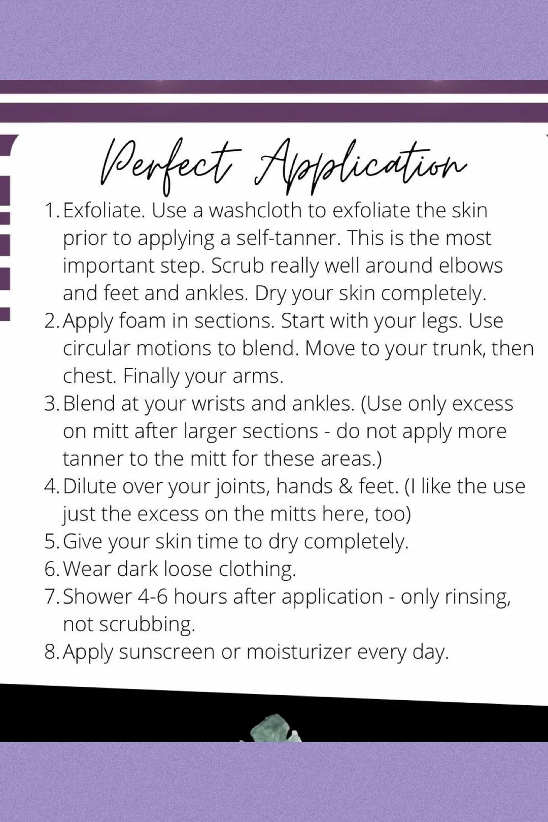 The perfect sunless self-tanner is here. Every order comes with a free mitt for perfect application. Vegan-friendly cruelty-free, gluten-free, paraffin-free, alcohol-free, phthalate-free, silicone-free, sulfate-free, paraben free. Vitamins and minerals nourish your skin: sunflower seed oil, vitamin e, cocoa butter; rosehip oil Provides the ultimate non-streak, non-yellow / non-orange toned tan. No orange. No dirty black/brown residue. Smells good. 4-6 hour developer. Lasts up to 2 weeks with proper pre-exfoliation moisturizer. Works for every skin tone, from pale blue undertones to dark yellow and olive that just needs a “boost” Each bottle comes with a mitt for application and a perfect application card with instructions.