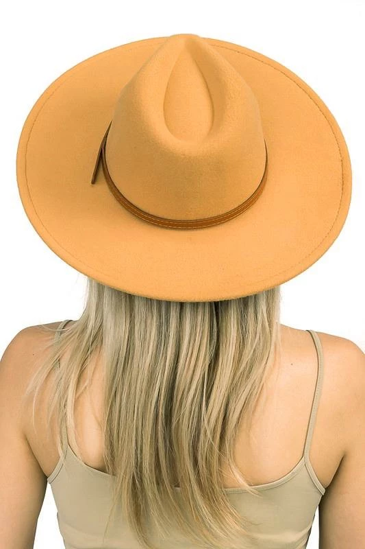 Introducing our Chic Rancher Felt Hat. It has a Belt Brim trim with adjustable inner drawstring.