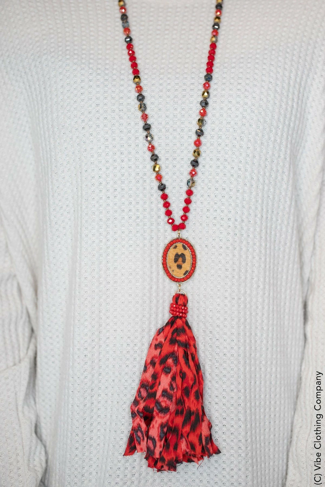 This fabulous necklace has a leopard medallion with a crystal beaded necklace and metallic tassel.
