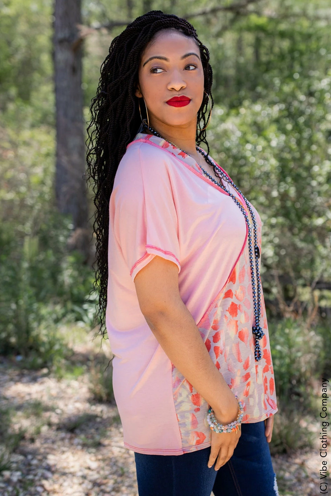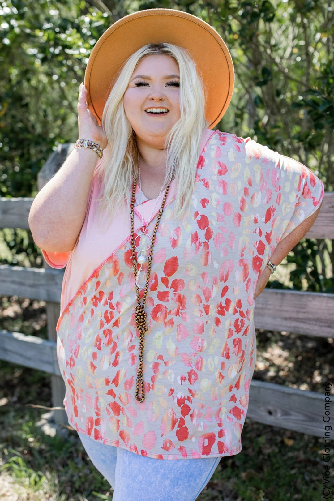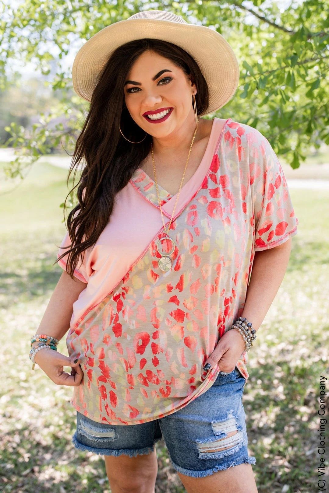 This short sleeve top has a vibrant coral color blocked with multi colored leopard print and reverse stiching detail! It is a fun pop in any wardrobe. The “X” pattern is so super flattering!