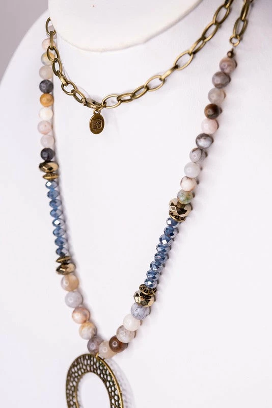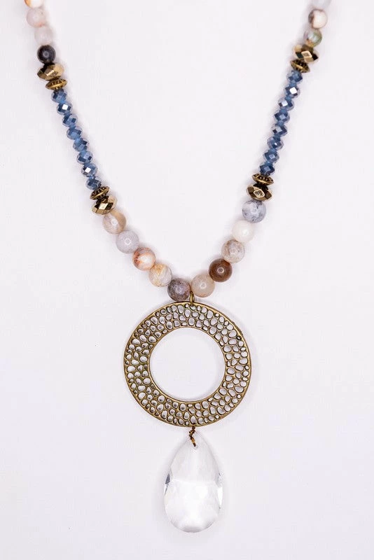Long necklace with round, textured metal pendant with large crystal teardrop. The necklace also features a matte gold chain link. The bottom half features beautiful natural stones with unique beads.