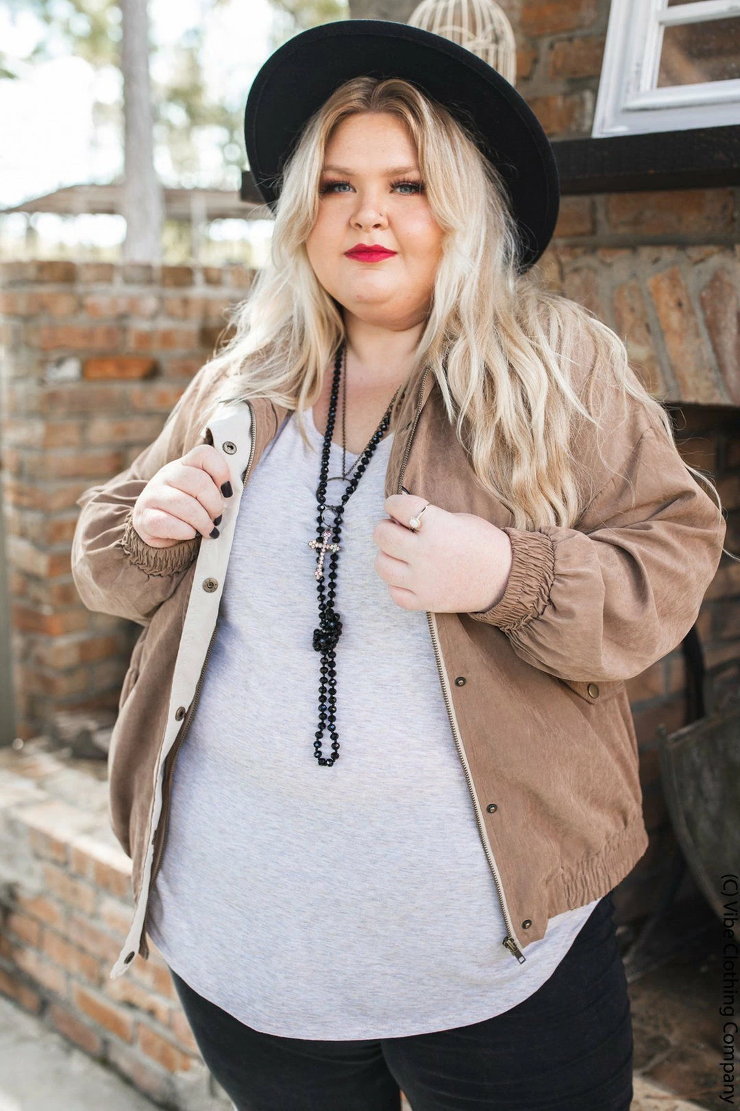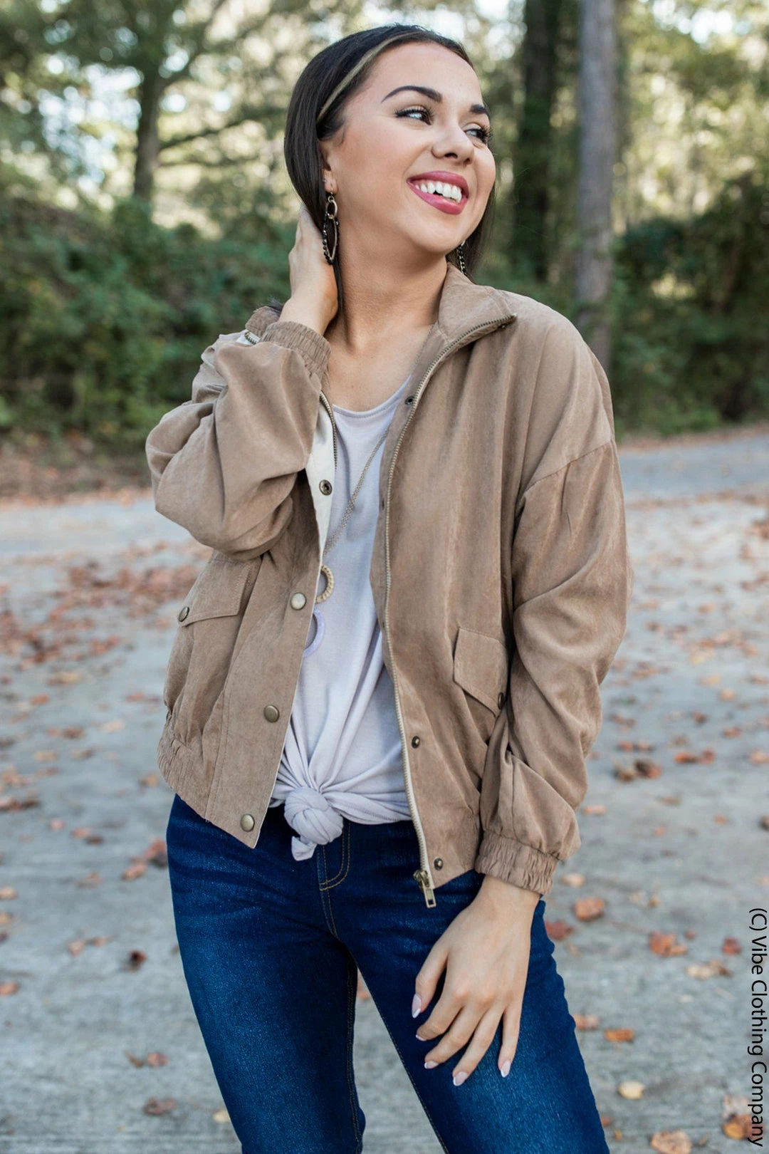 It has a neutral mocha color that will pair with everything in your wardrobe! With a classic fit, this Bomber jacket will flatter your figure in the best ways! This jacket is comfortable, light weight and easy to style! Simply, put it with a solid top and your favorite VIBE pants for an effortlessly and trendy look!