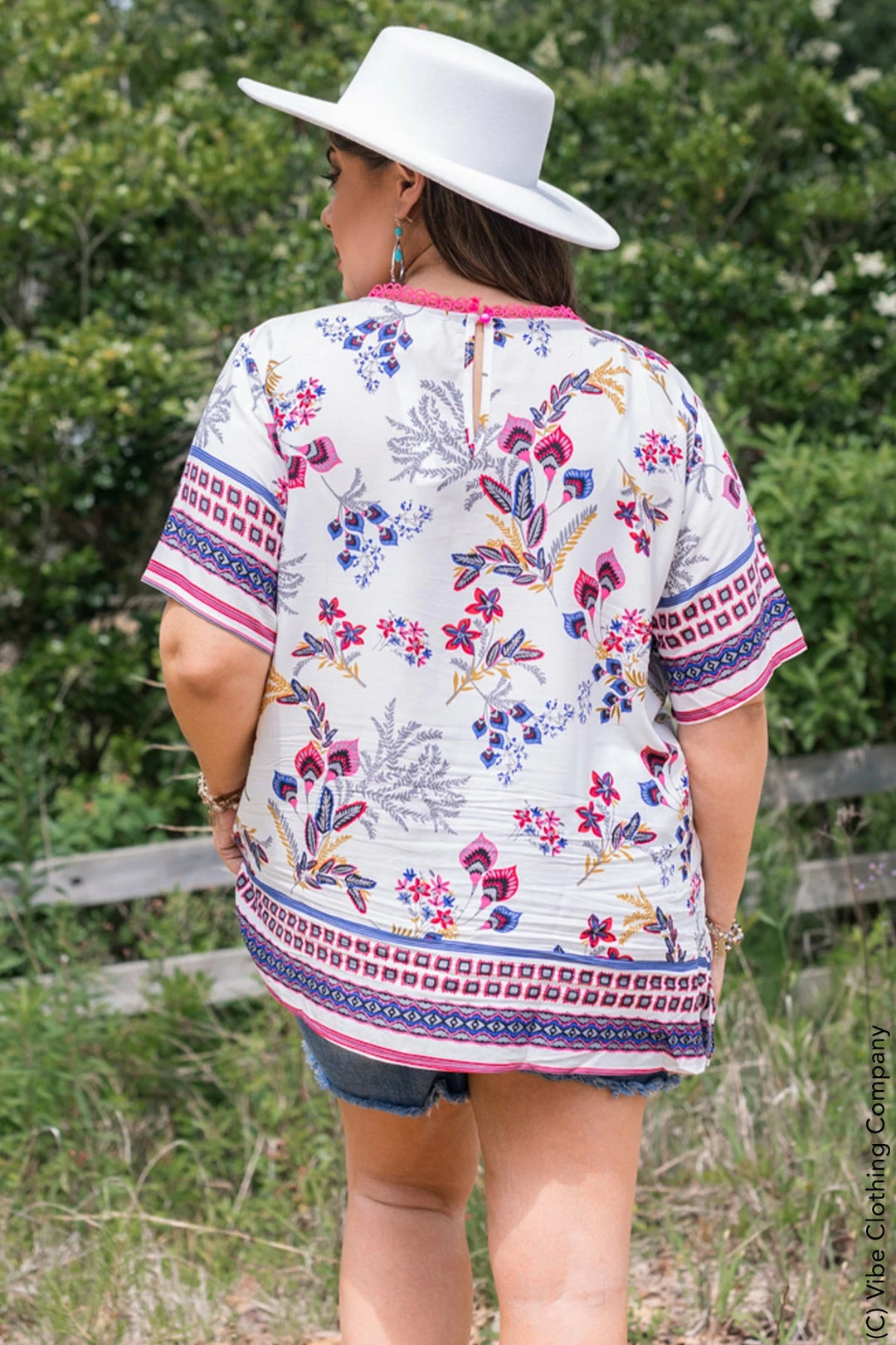 You will want to wear this comfy and super stylish top all the time! It’s V neck with crocheted hot pink trim. The fabric is beautiful, lightweight, and flowy!