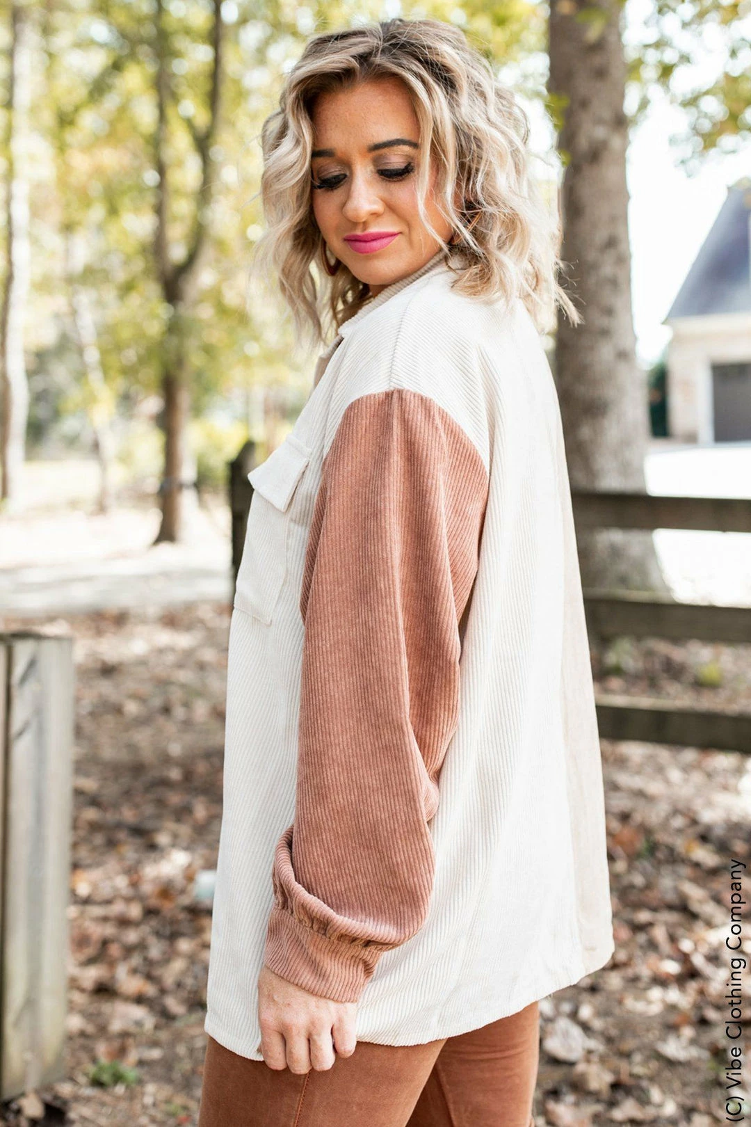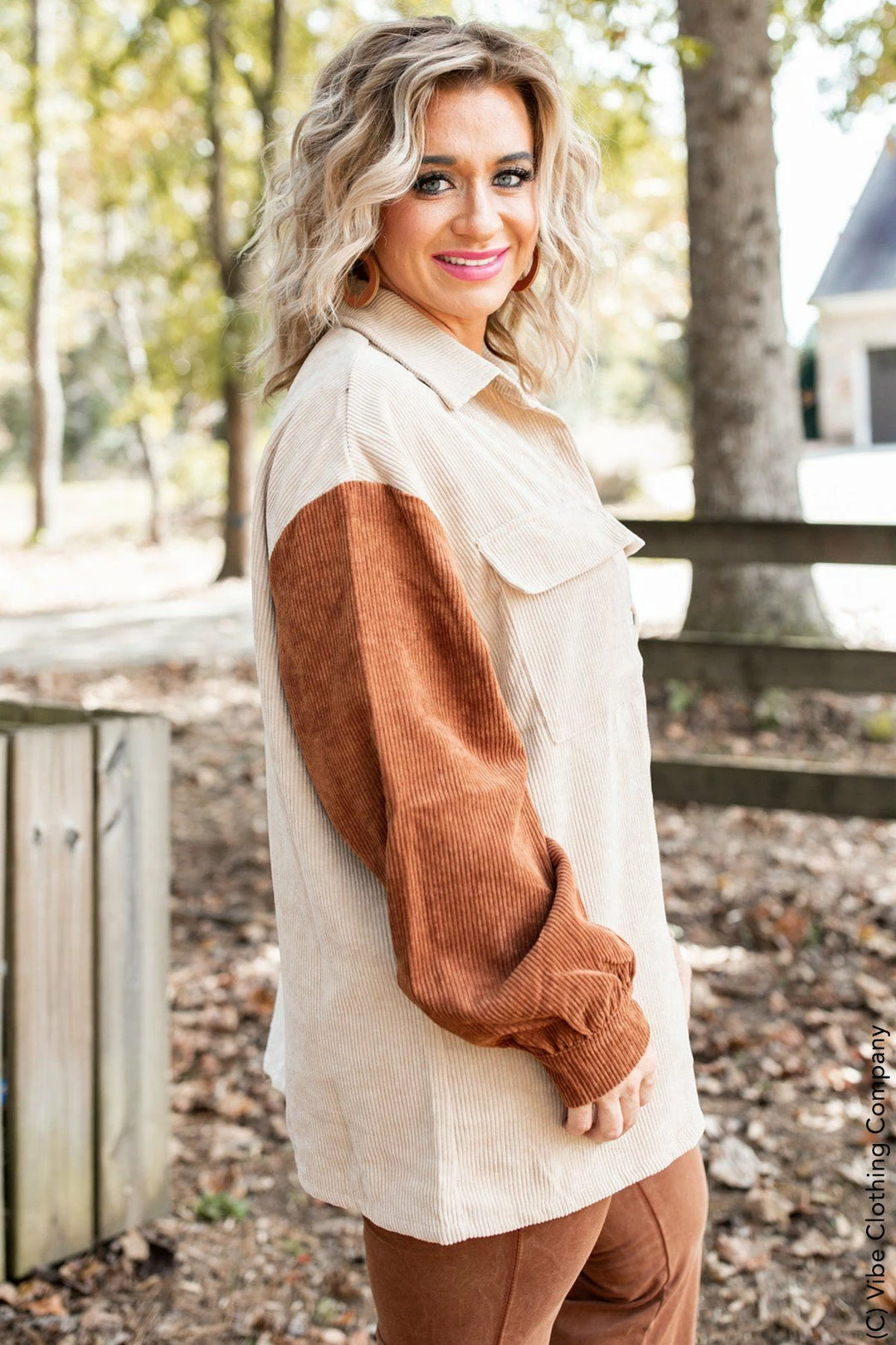 This “Shacket” (shirt + jacket) has a fabulous vintage feel featuring a relaxed fit. The fabric is extremely light weight! The 3 toned Corduroy and the two front pockets make this shacket so on trend!  It has relaxed, retro Vibes. Wear it alone or layer for a look that’s perfect for any time of year!
