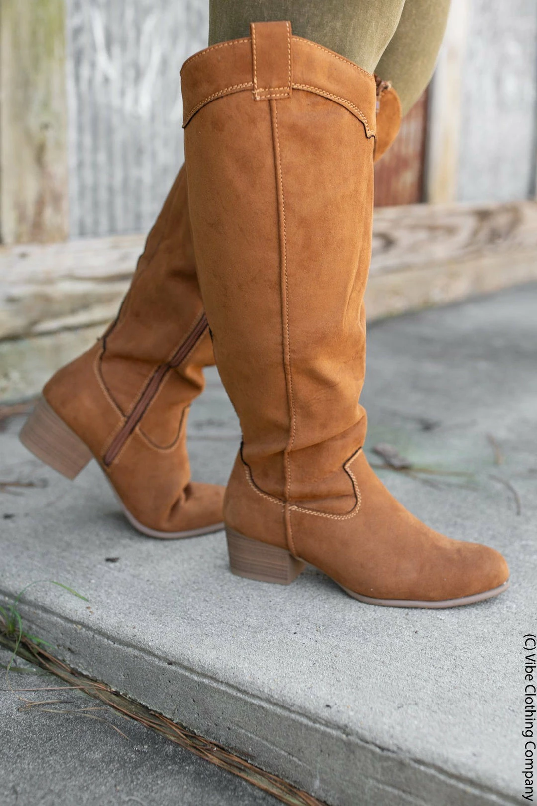 You NEED these boots for all your Fall and Winter outfits! They are a fabulous camel color, knee high style, and a super comfy fit. The soft rubber heel and the faux suede fabric makes them a winner! They are perfect for wearing with a cute dress or with a pair of skinnies and a sweater!