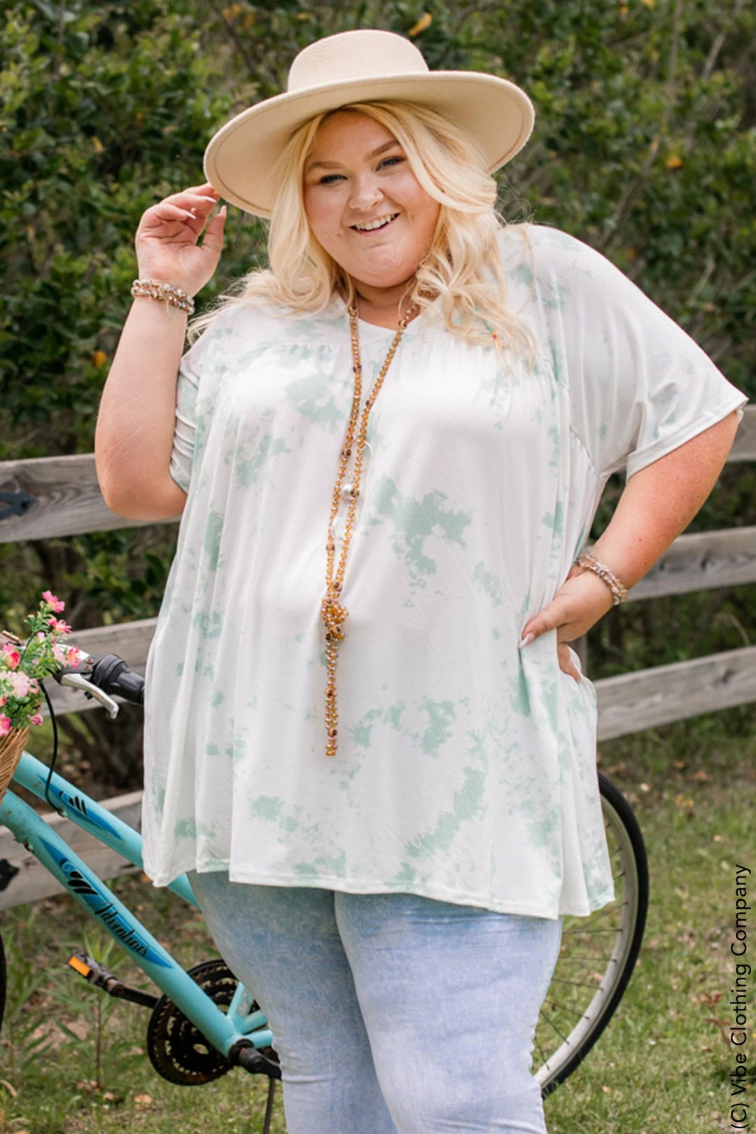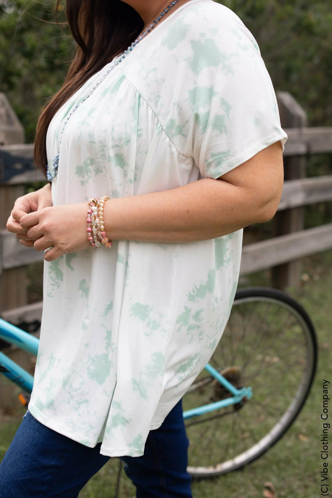 This Babydoll style top is oversized and is a must have this season! It is a soft sage green color on a white background. The colors of this top make it a great neutral to pair with anything. This timeless design and color combo will receive compliments and you’ll love it’s comfort! The fabric is super soft and stretchy.