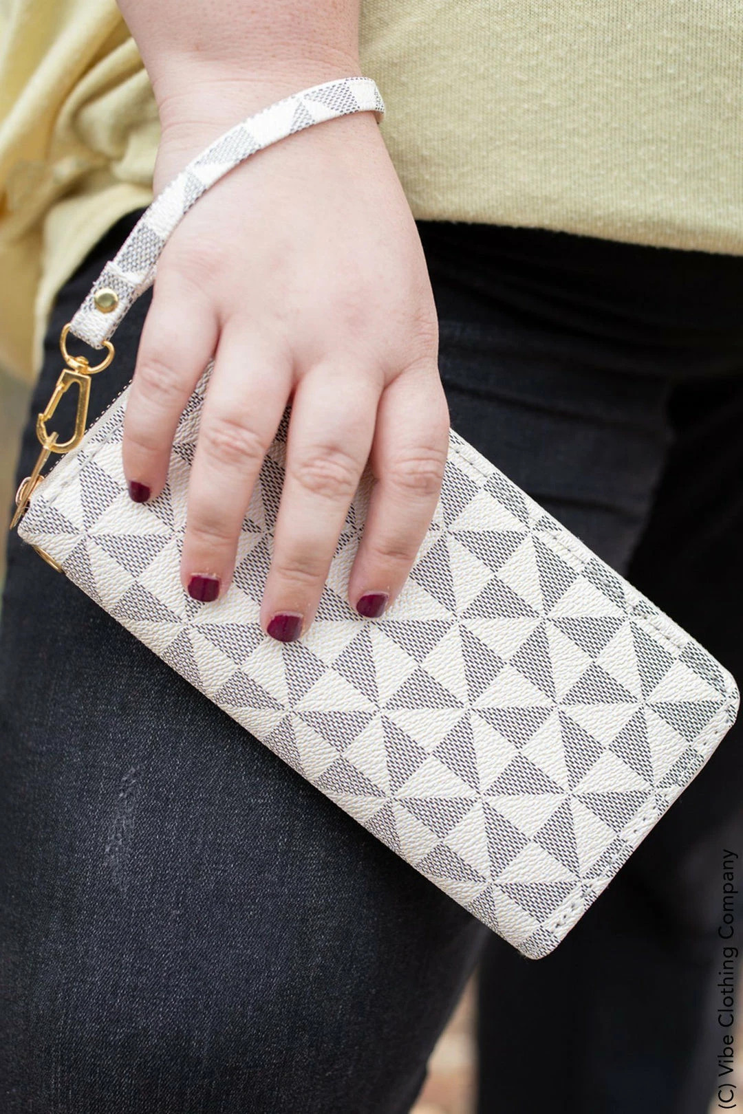Checkered monogram zip around wallet with gold tone hardware and removable wristband. The interior has a zipper for your change and also many slots for cards and cash.