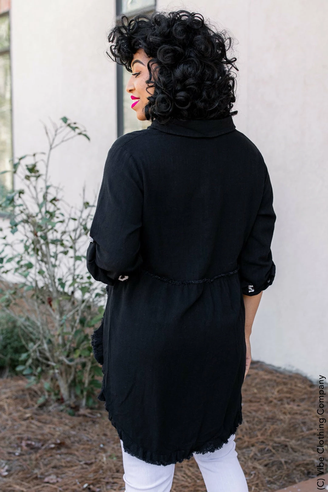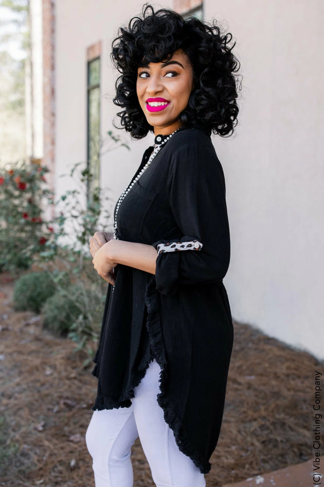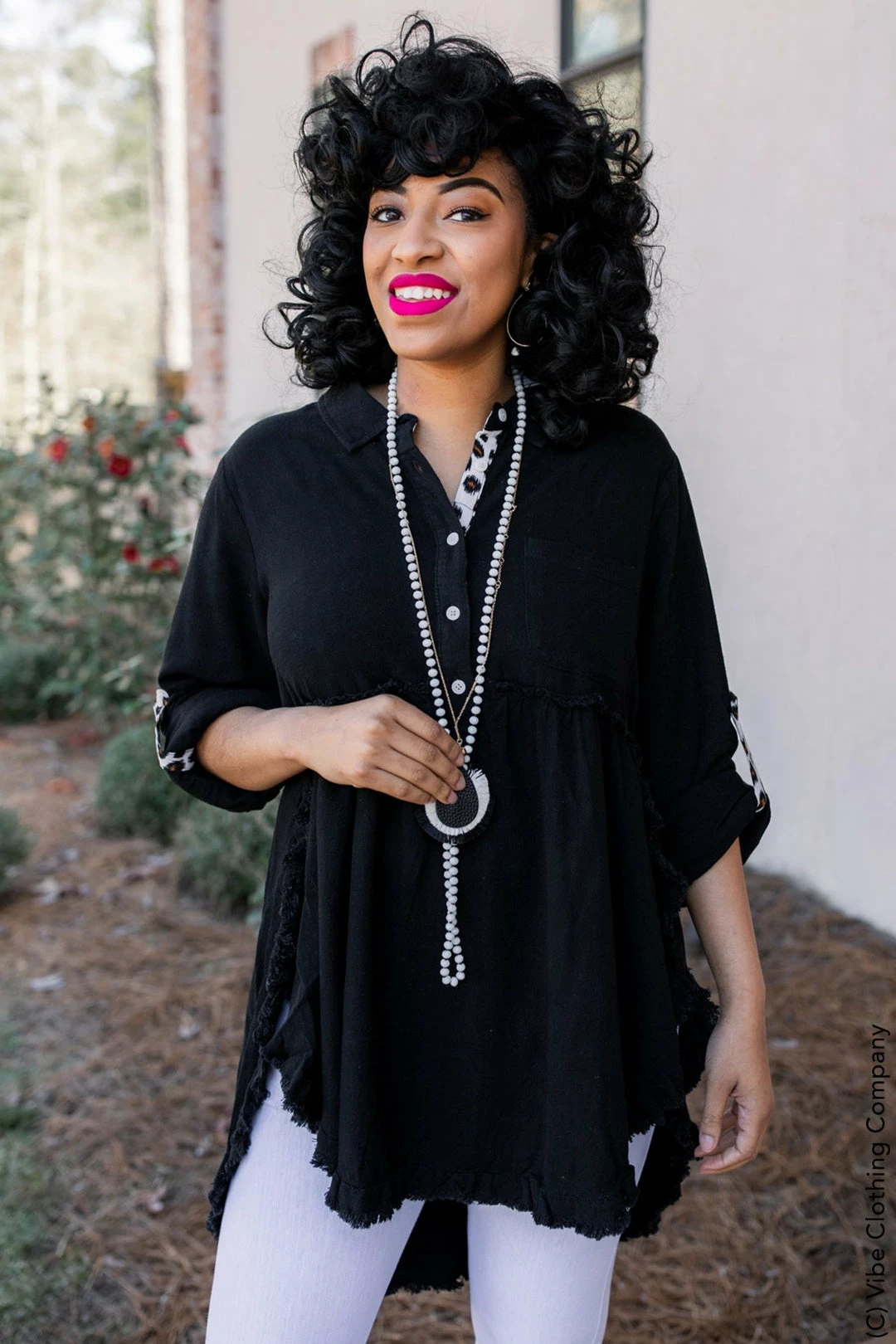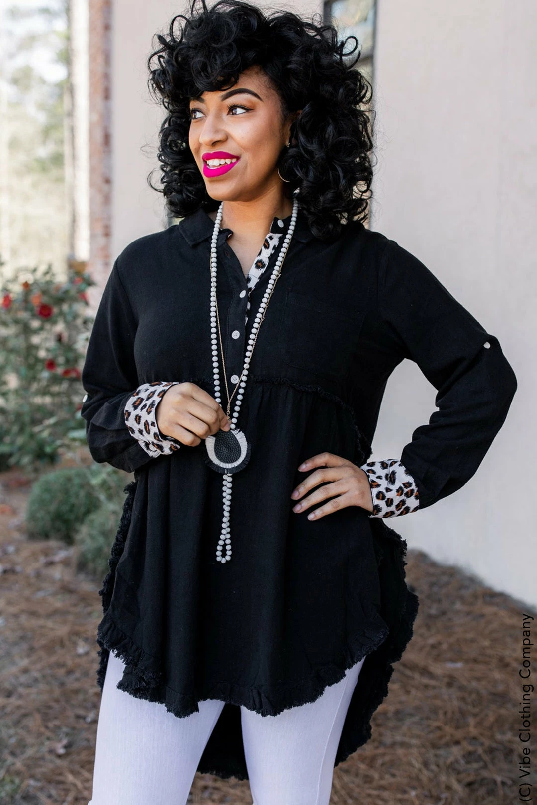 Our new Sweet is the Night Tunic is a soft and light linen blend. It is a tunic length with fringe tulip line splits on the side. The collar and cuffs have a leopard print trim that pops against the black. With a babydoll fit, chest pocket, and workable buttons are features that make this tunic oh so flattering.