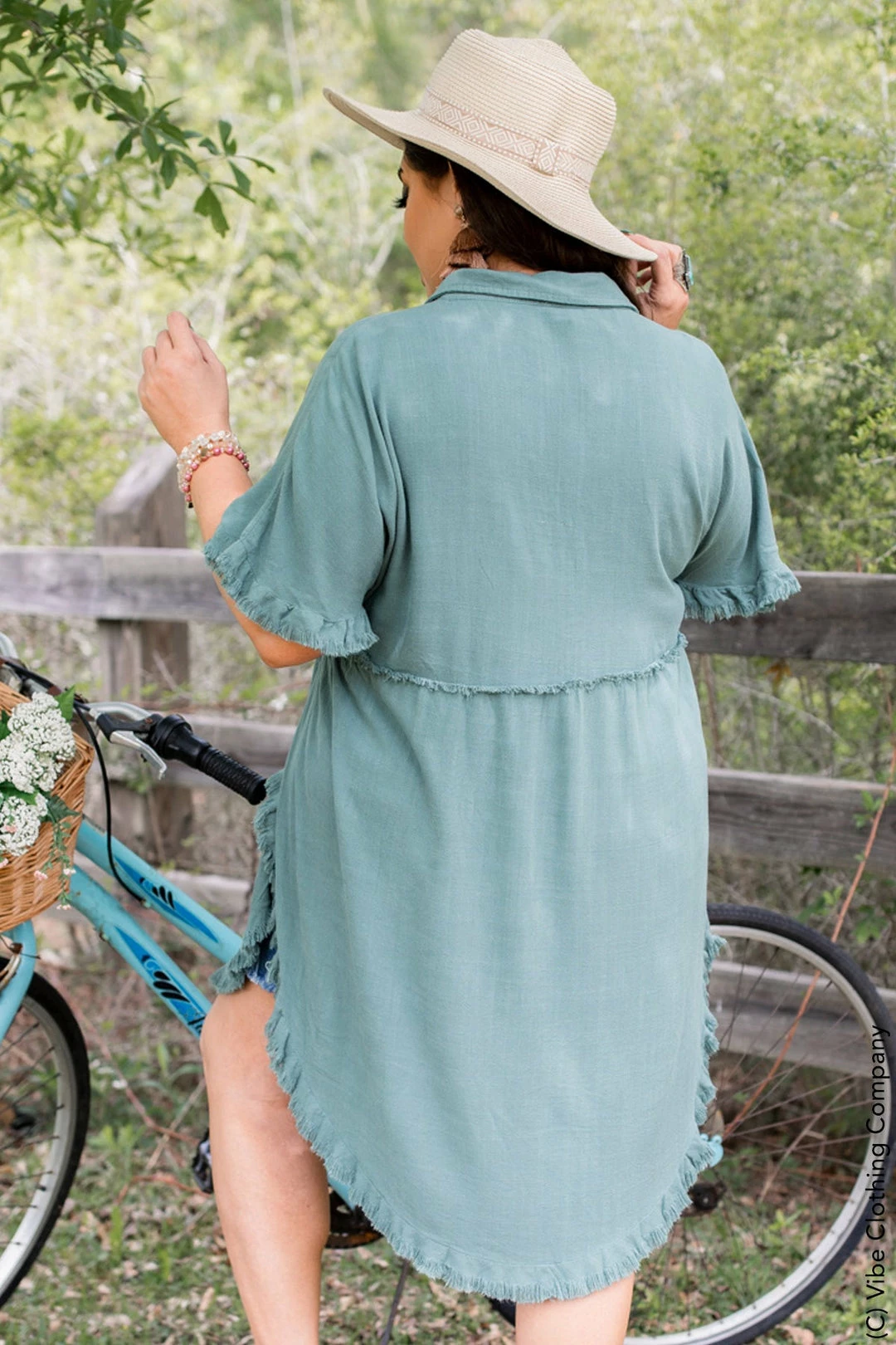 Our new Under the Sea Tunic is a soft and light linen blend. It is a tunic length with fringe tulip line splits on the side. The collar and front placket have a leopard print trim that pops against the lagoon green color. With a babydoll fit, chest pocket, and workable buttons are features that make this tunic oh so flattering. The new sleeve design have unfinished fringe hem.Â