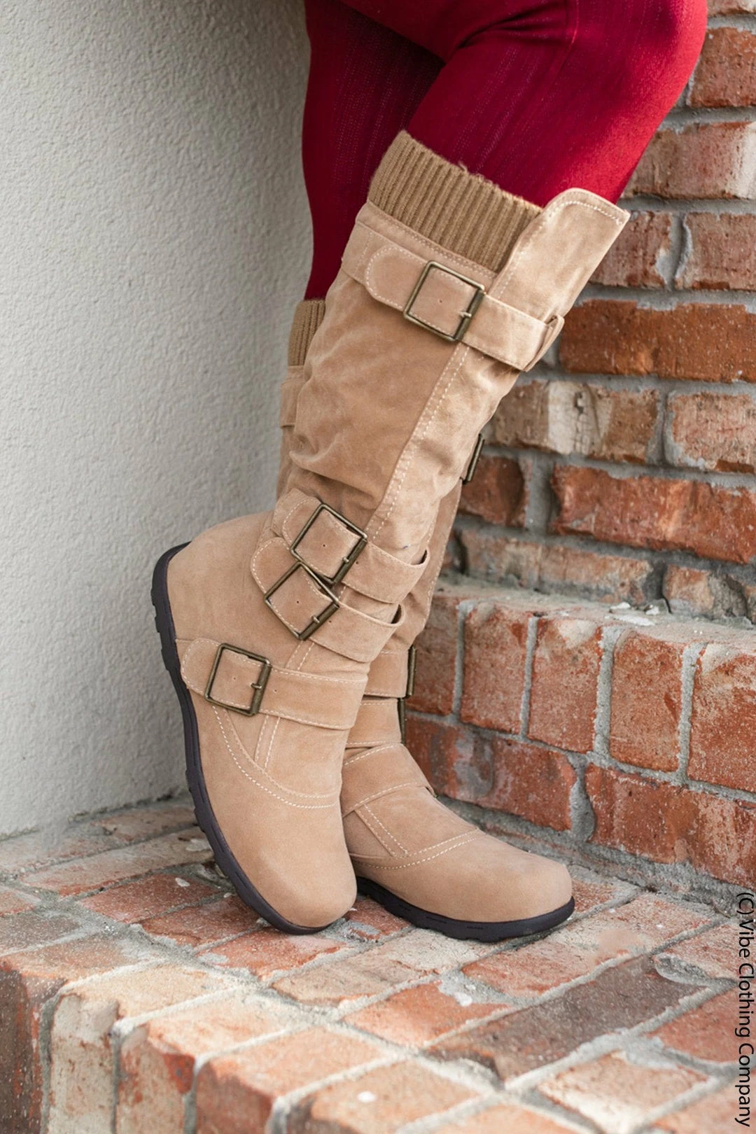 You NEED these boots for all your Fall and Winter outfits! They are a neutral taupe (Lt Camel) color, knee high style, and a super comfy fit. The cute buckle straps and the faux suede fabric makes them a winner! They are perfect for wearing with a cute dress or with a pair of skinnies and a sweater!