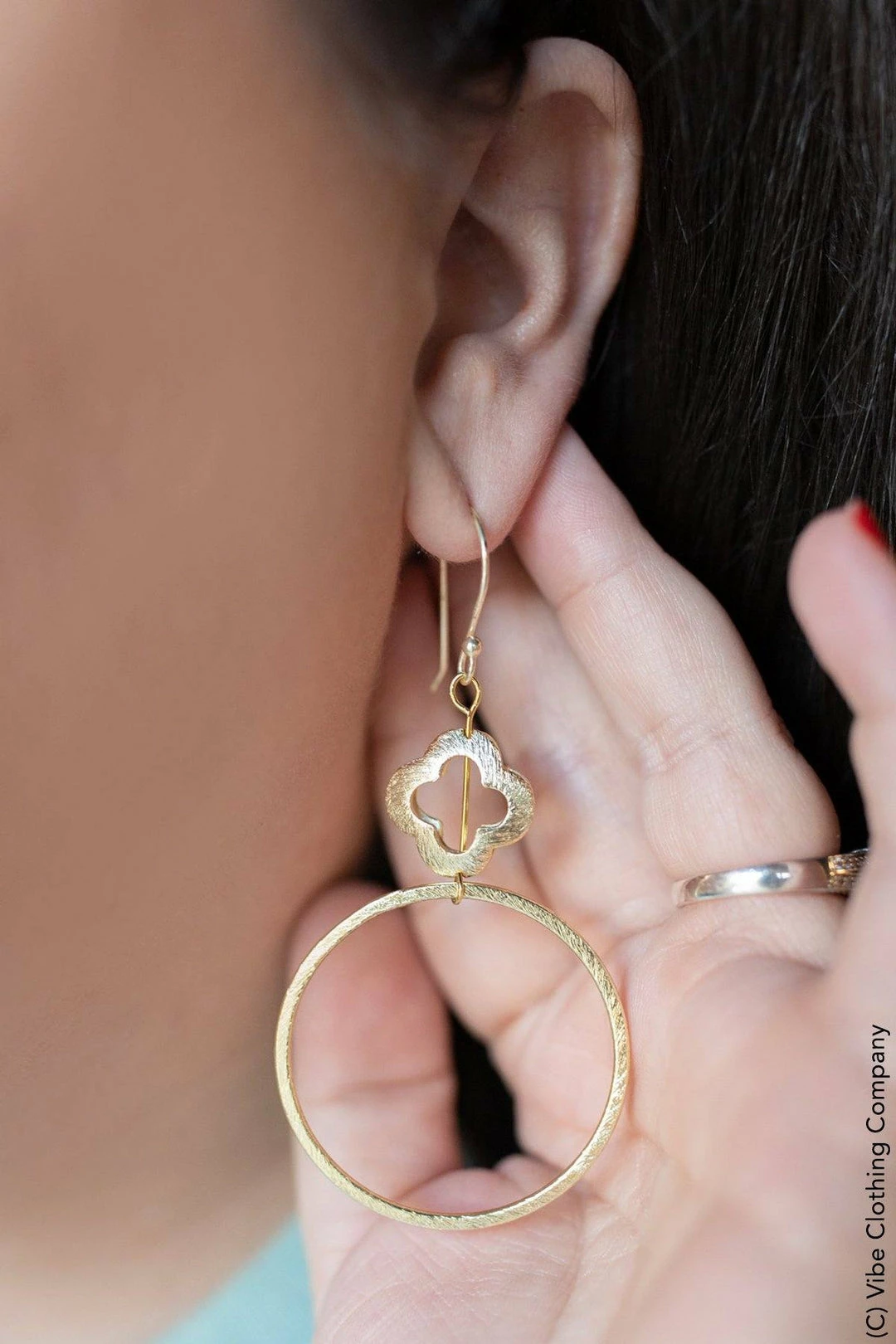 Soon to be your favorite earrings, these dangling hoops with make any outfit pop! The gold circle are made fancy with the gold clover charm.Â